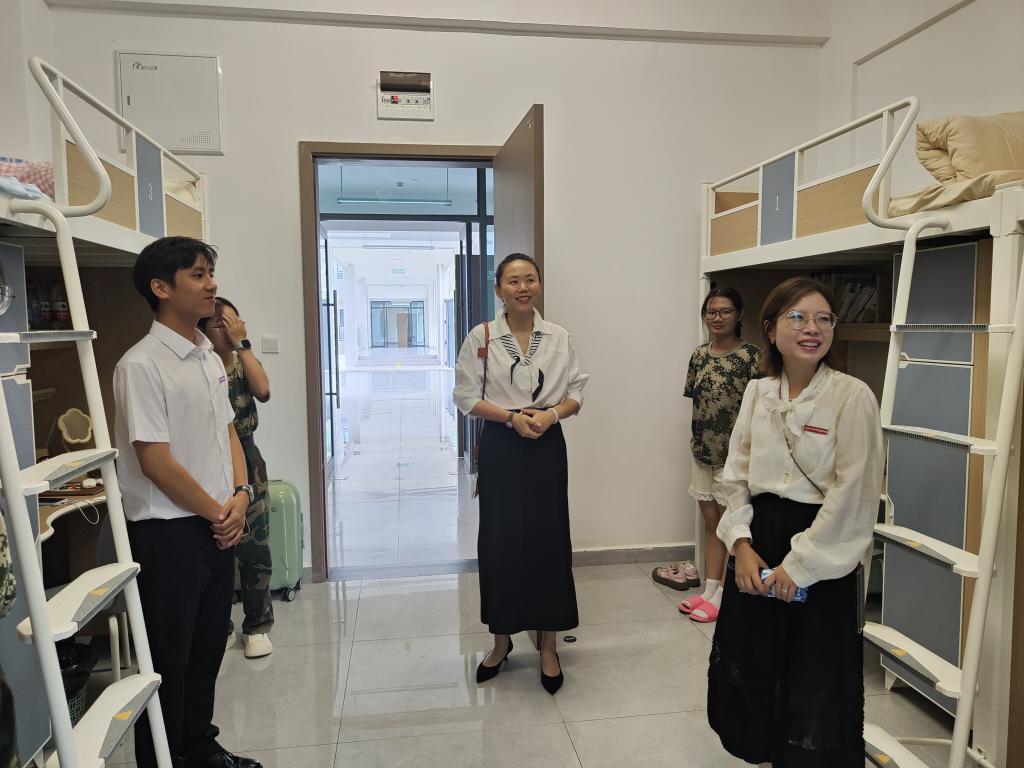 9月30日军训汇报结束后,学院党总支书记陈泓吉专程走进新生寝室慰问。她查看居住环境,询问军训后身体恢复与生活适应情况,特别叮嘱计划回家的同学注意往返交通安全、做好防护,遇问题及时沟通,让同学们在异乡感受到“家人般”温暖。