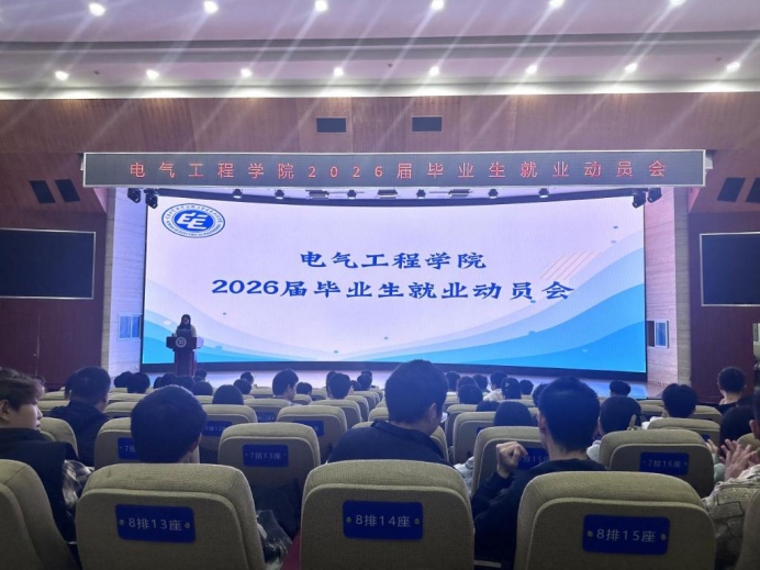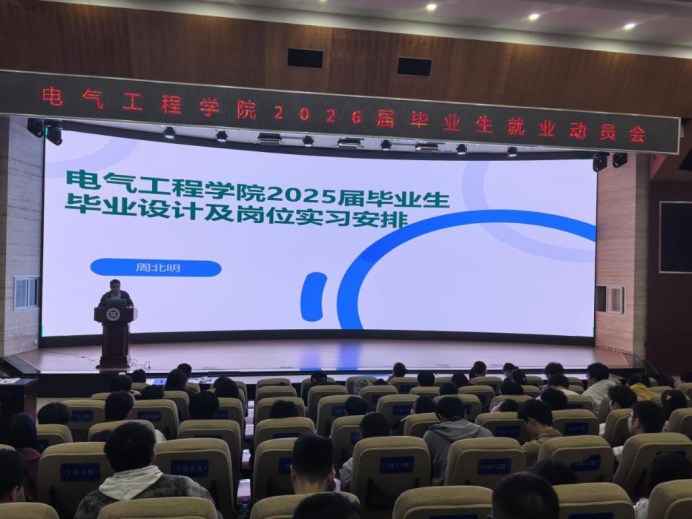 为深入贯彻“稳就业”战略部署,帮助2026届毕业生认清就业形势、明晰职业方向、提升求职竞争力,10月28日,电气工程学院在第一学术报告厅和第二学术报告厅同步召开2026届毕业生就业动员大会。学院党总支书记、副院长陈泓吉、轨道机电技术教研室主任周北明、就业干事吴丹、毕业班辅导员老师以及2025届全体学生到场参会。大会由学院学生工作办公室主任周莉主持。
