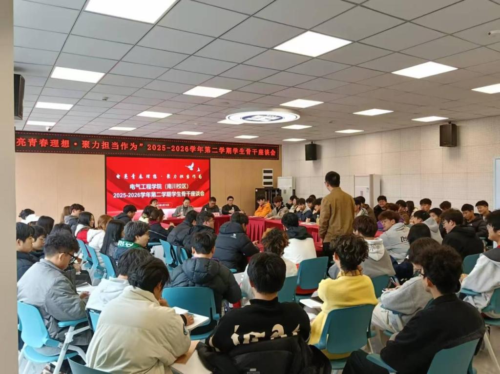 为加强学院与学生骨干的沟通交流,凝聚学生工作合力,充分发挥学生骨干的桥梁纽带与模范带头作用,3月19日,电气工程学院在南川校区风华斋(8号楼)召开2025-2026学年第二学期学生骨干座谈会。学院党总支书记陈泓吉,副院长朱开波,南川校区综合负责人肖俊伊,专职辅导员以及学院学生会临时负责人、各班班长、团支书、学习委员等学生骨干参会。